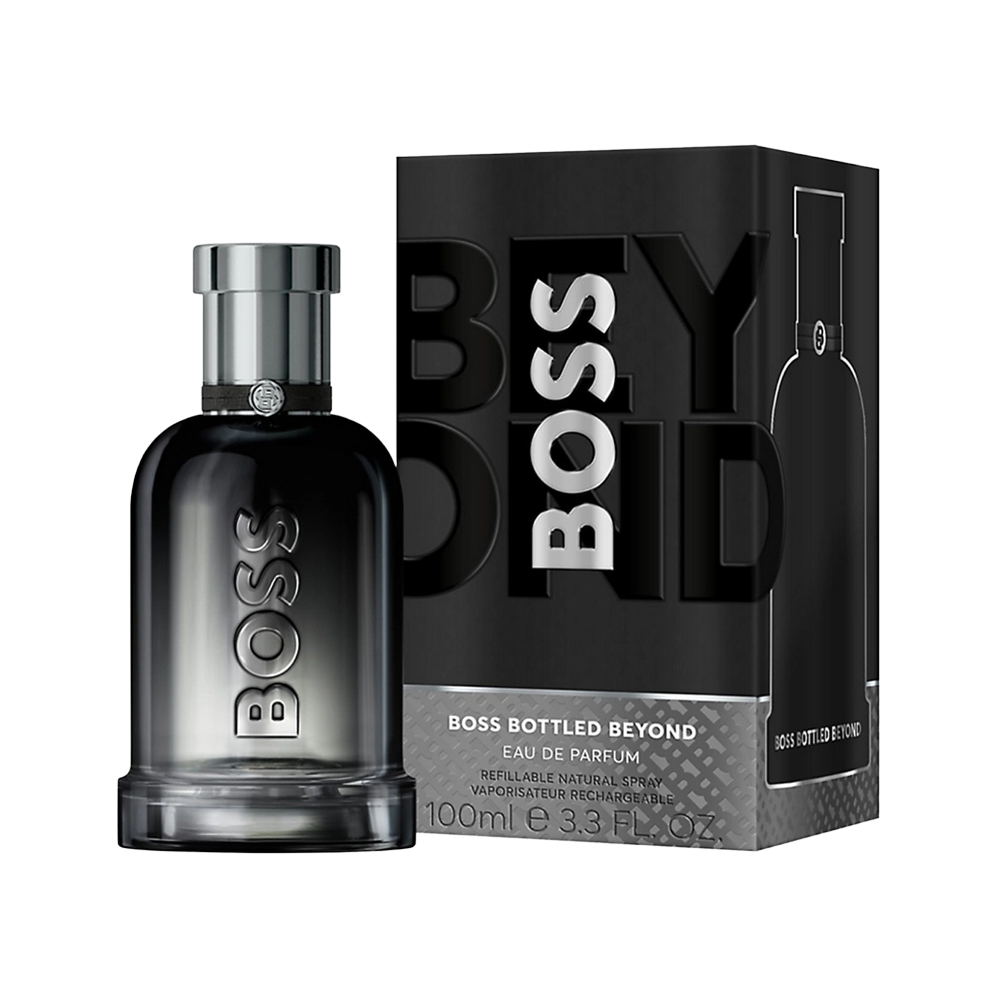 Encased in a sleek black lacquered bottle with a smoky gradient, double-leather detailing, and a gunmetal-grey cap, BOSS Bottled Beyond is crafted for men who inspire others and push past limits—bold, balanced, and undeniably beyond.